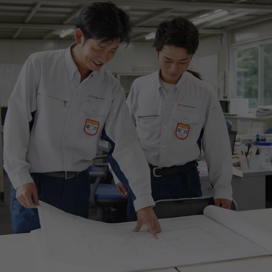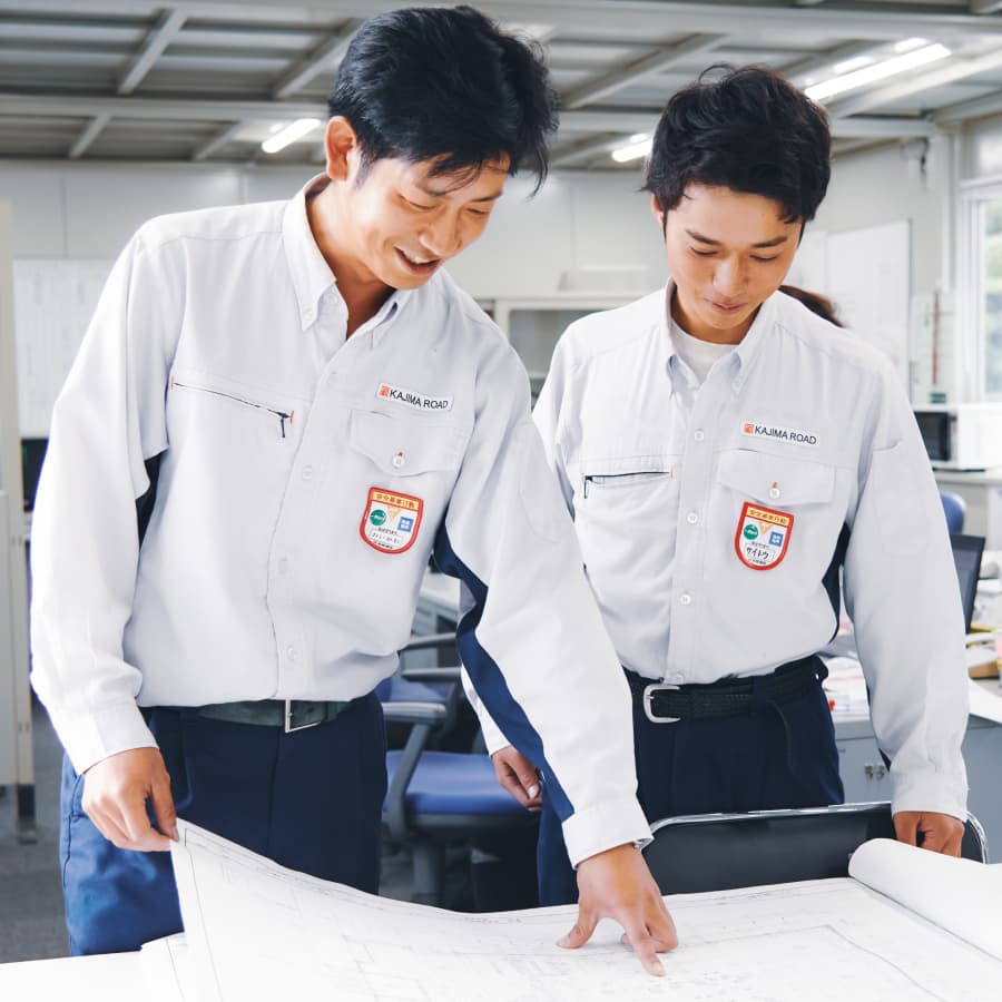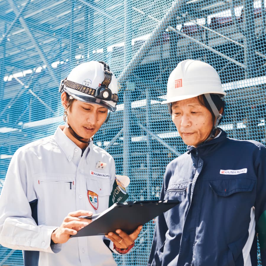 技術研究所や支店試験所において、お客様や施工現場のニーズを聞きながら、工法や材料の研究開発を行う仕事や高速道路・空港・ダム工事等大型工事現場での技術支援等を行う仕事があります。『技術のスペシャリスト』として、変化の激しい時代に若い皆さんの新しい考えを取り入れて、技術開発を行い、強い鹿島道路をつくっていきます。