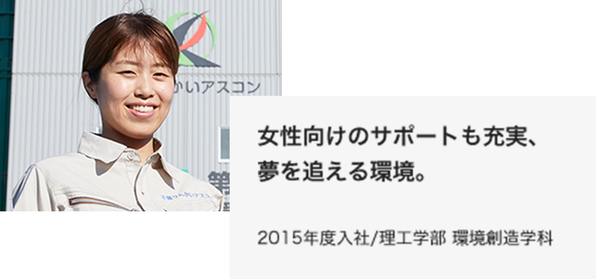 技術研究所や支店試験所において、お客様や施工現場のニーズを聞きながら、工法や材料の研究開発を行う仕事や高速道路・空港・ダム工事等大型工事現場での技術支援等を行う仕事があります。 『技術のスペシャリスト』として、変化の激しい時代に若い皆さんの新しい考えを取り入れて、技術開発を行い、強い鹿島道路をつくっていきます。